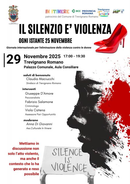 A Trevignano Romano, la lotta contro la violenza sulle donne non si ferma al 25 novembre. Sabato 29 novembre 2025, dalle 17:00 alle 19:30, l’Aula Consiliare del Palazzo Comunale ospiterà l’incontro “Il Silenzio è Violenza – Ogni istante 25 novembre”, un momento pubblico dedicato alla sensibilizzazione, al confronto e alla memoria.
