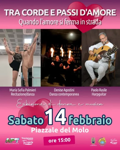 Il San Valentino a Trevignano Romano quest’anno cambia atmosfera. Sabato 14 febbraio 2026, alle 15:00, il Piazzale del Molo ospita “Tra corde e passi d’amore”, un’esibizione di danza e musica dal vivo che porta l’arte direttamente nello spazio pubblico.