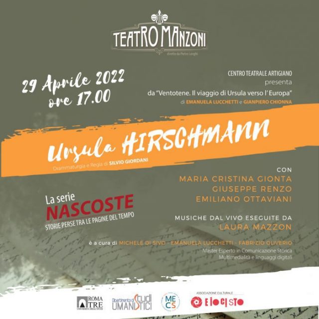 Una nuova iniziativa al Teatro Manzoni di Roma: il prossimo 29 aprile alle ore 17.00 prende il via con “Ursula Hirschmann” – drammaturgia e regia di Silvio Giordani – la serie teatrale Nascoste. Storie perse tra le pagine del tempo, a cura di Michele Di Sivo, Emanuela Lucchetti e Fabrizio Oliverio.
